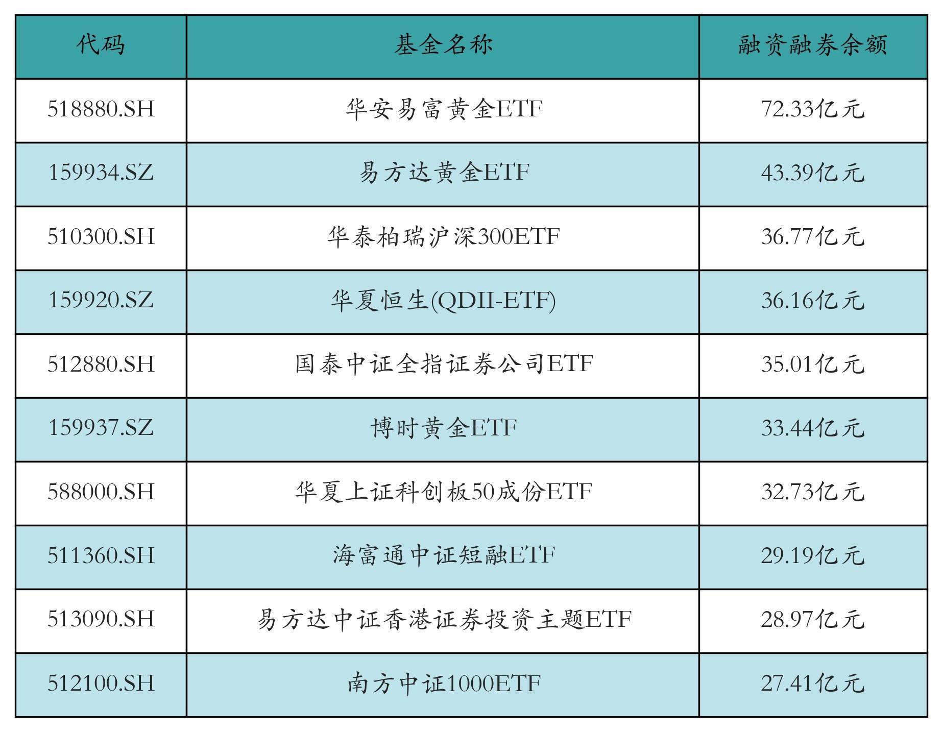 12月29日ETF两融余额前三位分别为:华安易富黄金ETF(72.33亿元)、易方达黄金ETF(43.39亿元)和华泰柏瑞沪深300ETF(36.77亿元),前10具体见下表: