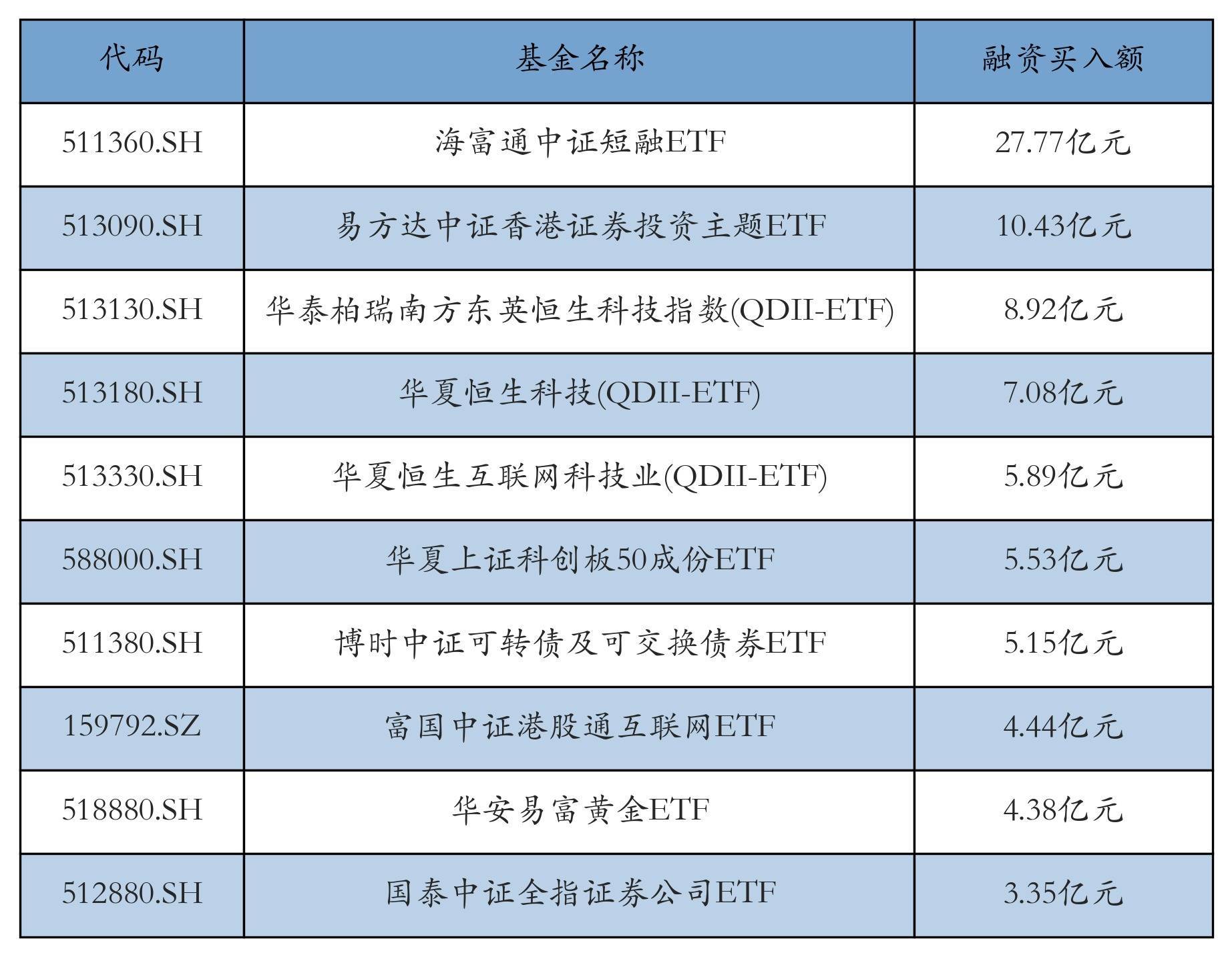 12月29日ETF融资买入额前三位分别为:海富通中证短融ETF(27.77亿元)、易方达中证香港证券投资主题ETF(10.43亿元)和华泰柏瑞南方东英恒生科技指数(QDII-ETF)(8.92亿元)乾鑫配资,前10具体见下表: