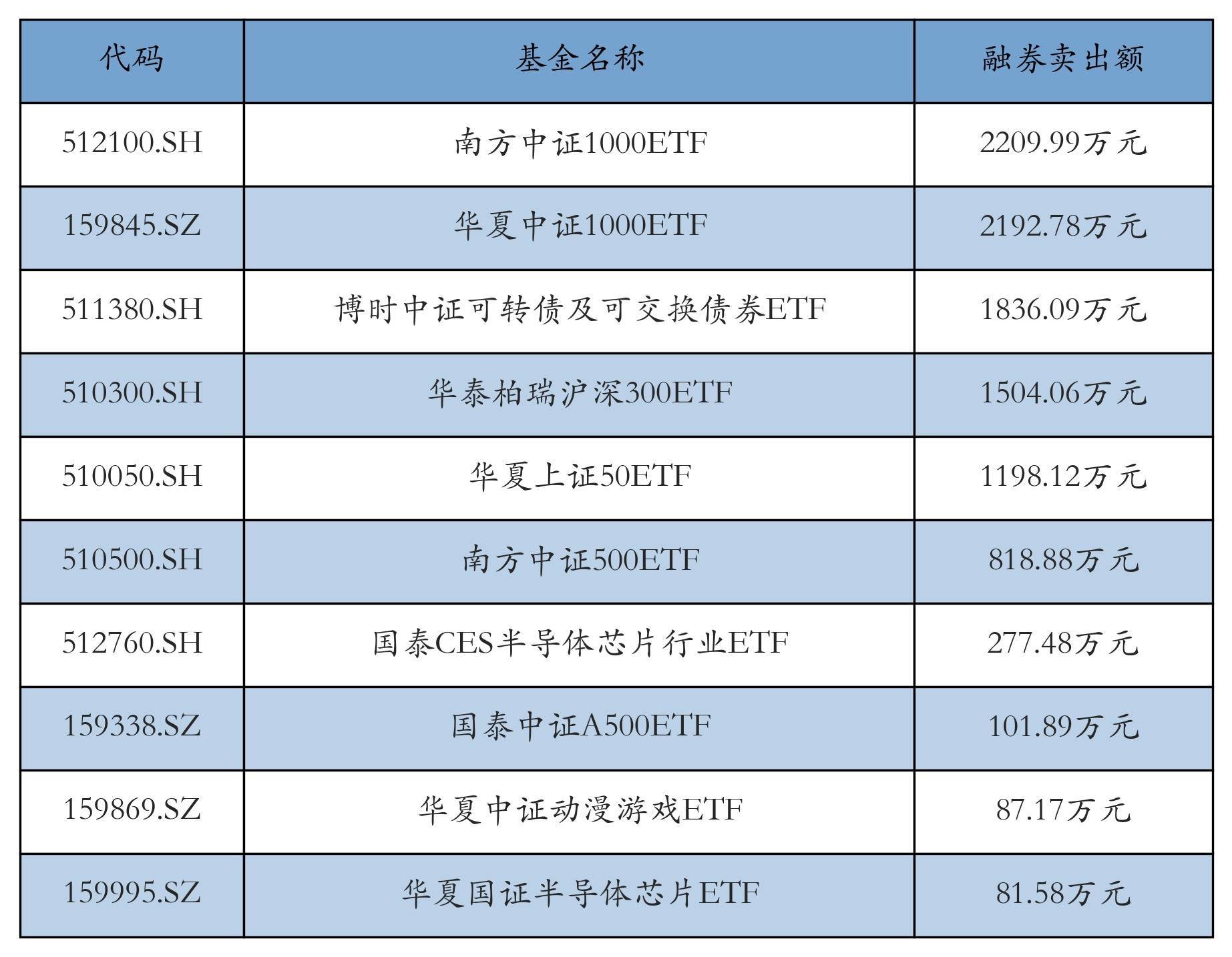 12月29日ETF融券卖出额前三位分别为:南方中证1000ETF(2209.99万元)、华夏中证1000ETF(2192.78万元)和博时中证可转债及可交换债券ETF(1836.09万元),前10具体见下表: