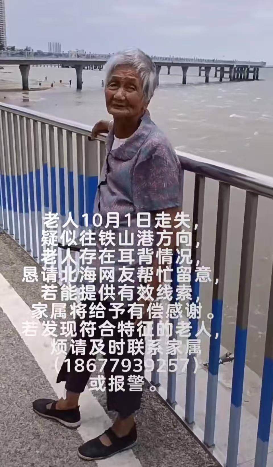 10月1日,广西北海大浪头村88岁的钟奶奶,在自家附近遛弯时不慎走失。10月2日,钟奶奶的孙女向记者透露,老人走失时身着黑色裤子与粉色上衣,家人目前正焦急寻找。