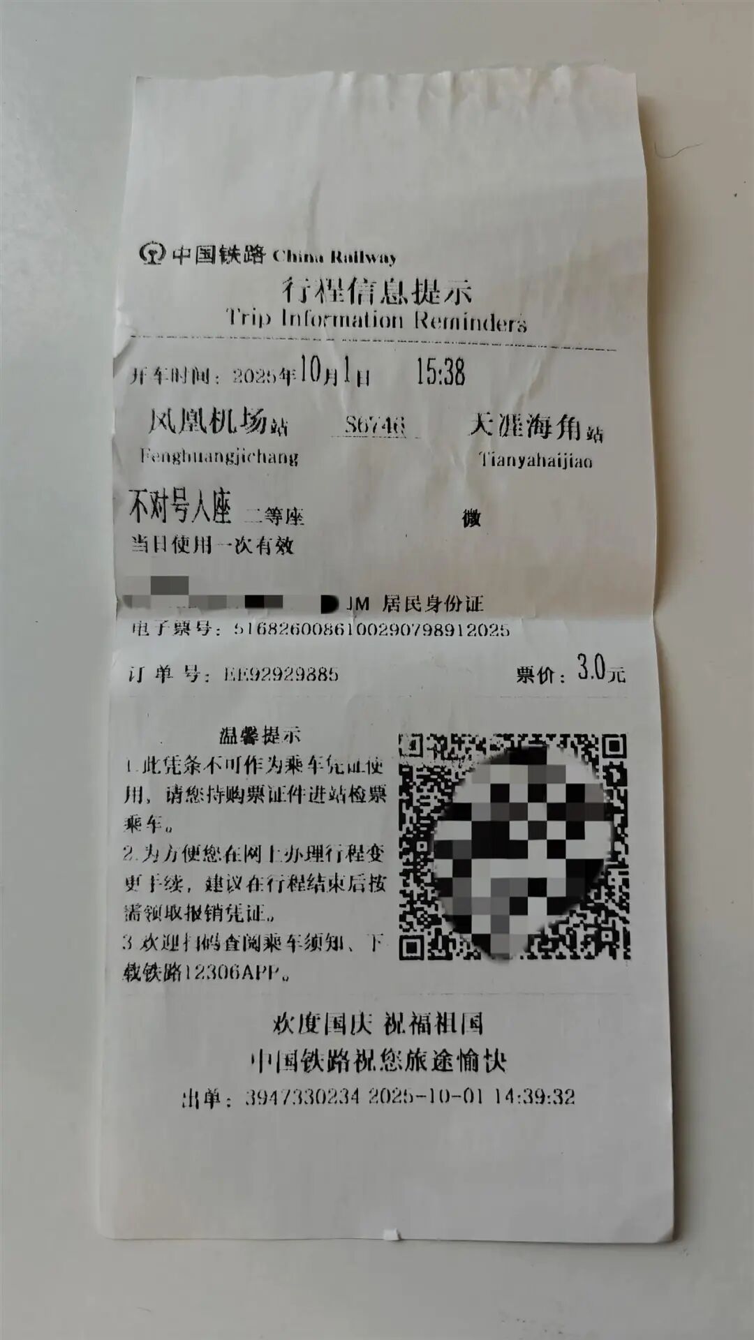 10月1日下午,极目新闻记者来到西安火车站,同样购买了当天15点38分从凤凰机场站至天涯海角站的车票,票价3元。